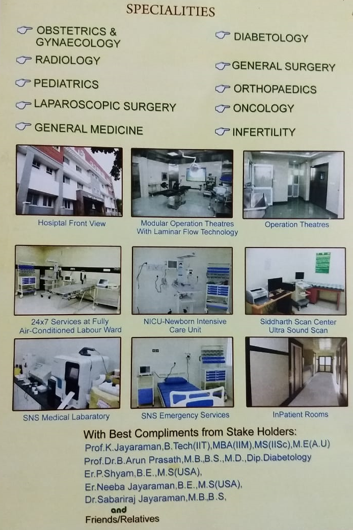 SNS MULTISPECIALITY HOSPITAL (SNS மருத்துவமனை) ஆகஸ்ட் 31, திங்கள்கிழமை அன்று திறப்பு விழா காண்கிறது என்பதை மகிழ்ச்சியுடன் தெரிவித்துக்கொள்கிறோம்.
